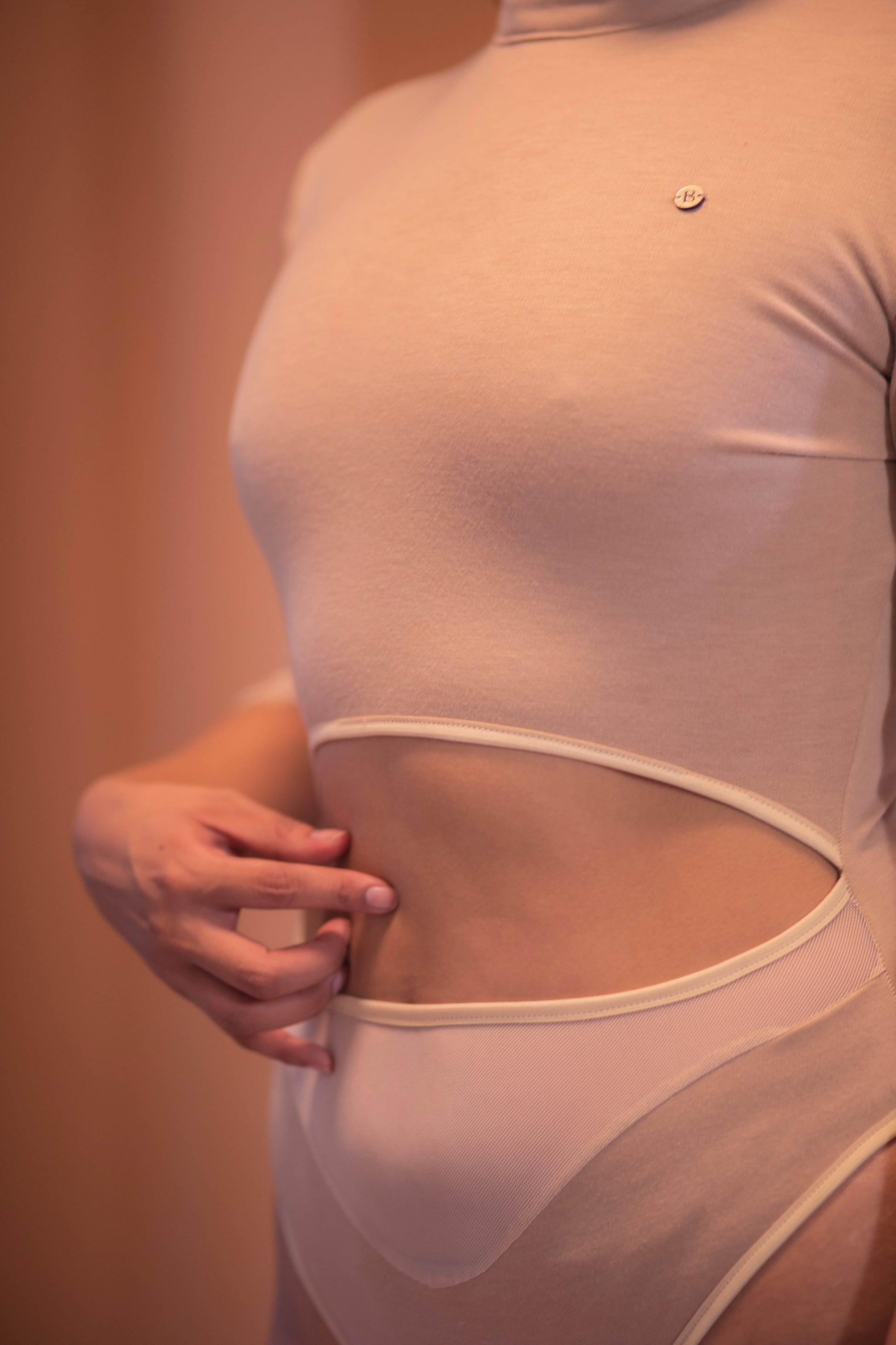 Show your middle zone in this cotton bodysuit with a mesh opening at the bottom's center. Sleeves are 3/4.
