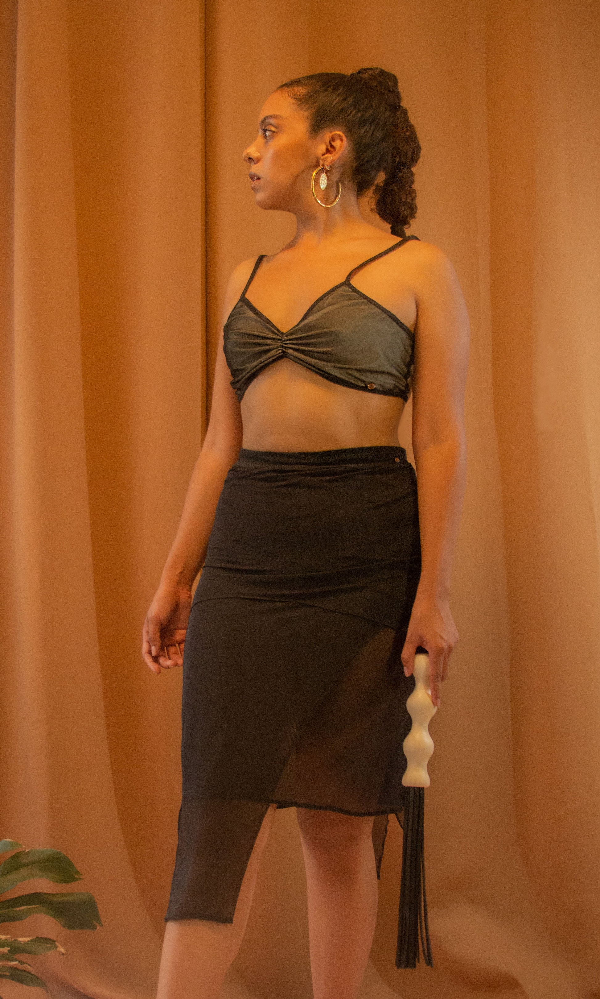 One of a kind mesh pencil skirt created from leftover black mesh. It features a sexy leg opening and three layers of mesh in different lenghts, so visibility in some areas in more reduced than in others.