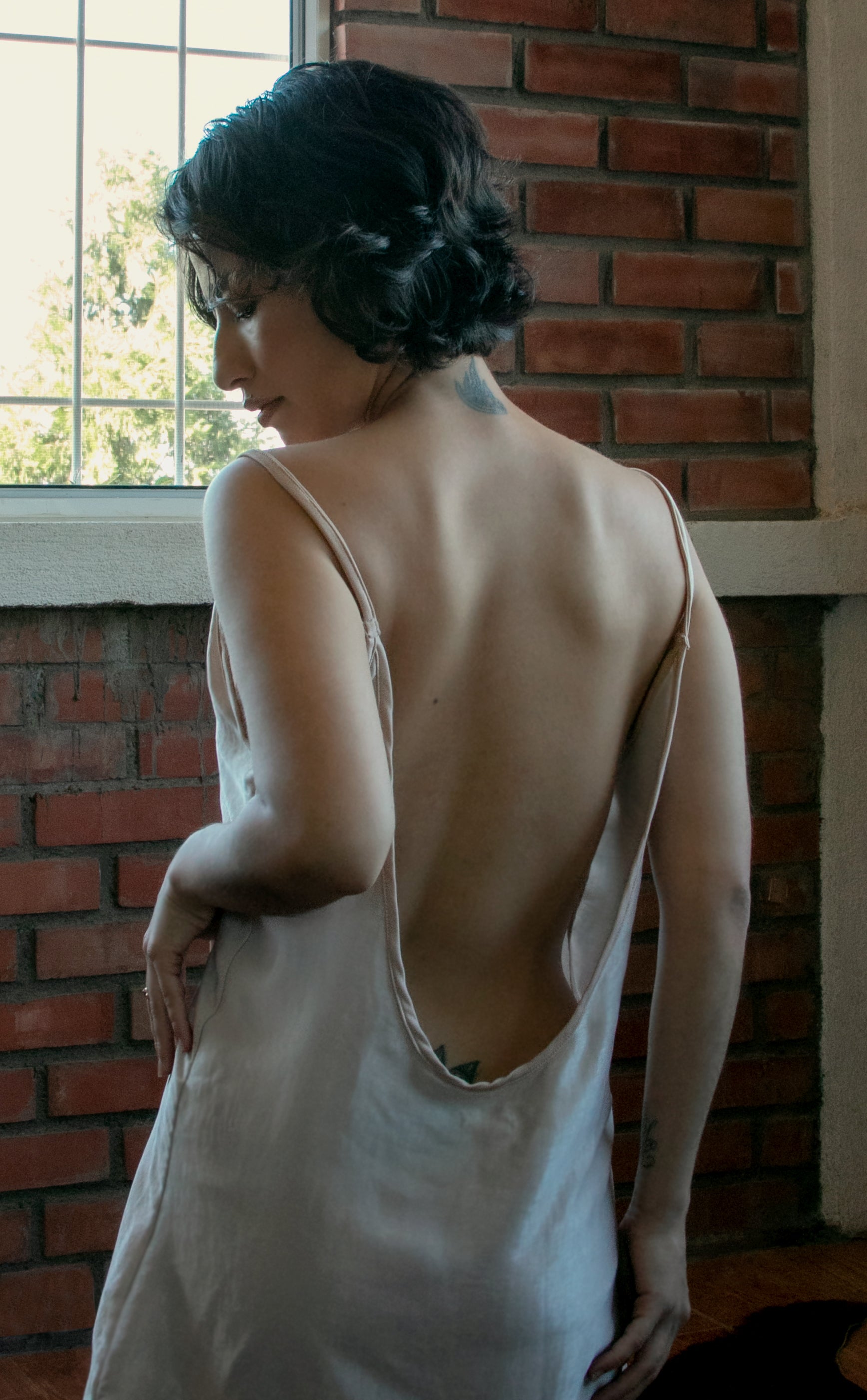 This slip dress is simple yet very sensual due to it's low back and silky touch.